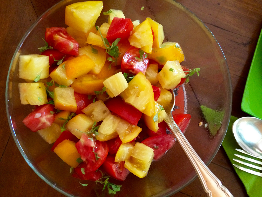 E allora, anche in onore della nipote losangelina che ci sta dando il piacere di passare da noi qualche giorno prima della partenza, oggi a pranzo niente yogurt ma un’insalata di pomodori giallorossa. L’insalata “del Capitano”.