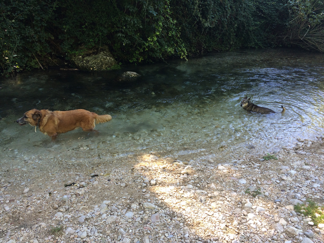 Ecco Orsetta quando, a metà passeggiata, fa il bagno nel Farfa. Guardandosi bene dal nuotare, beve azzannando l’acqua.