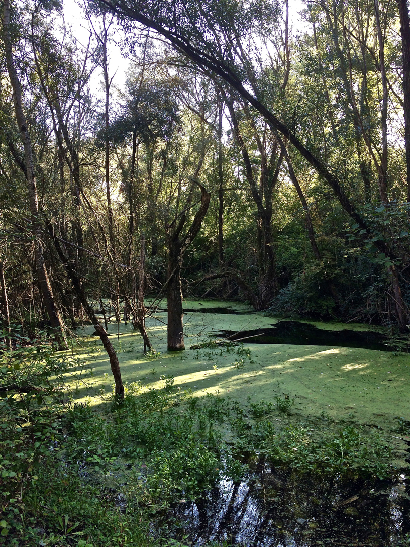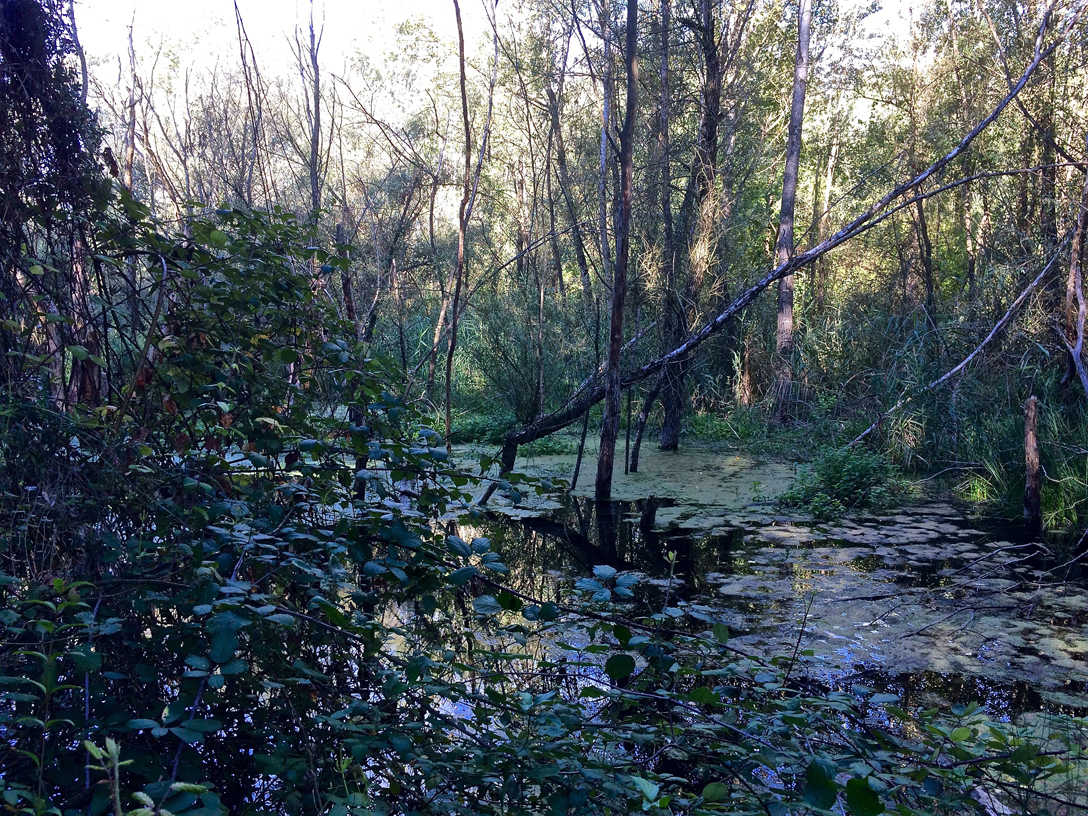 Per arrivare al sentiero che segue la riva del fiume c’è un percorso nuovo, che passa su una lingua di terra con la palude da entrambi i lati (siamo o no nei Pantani?)