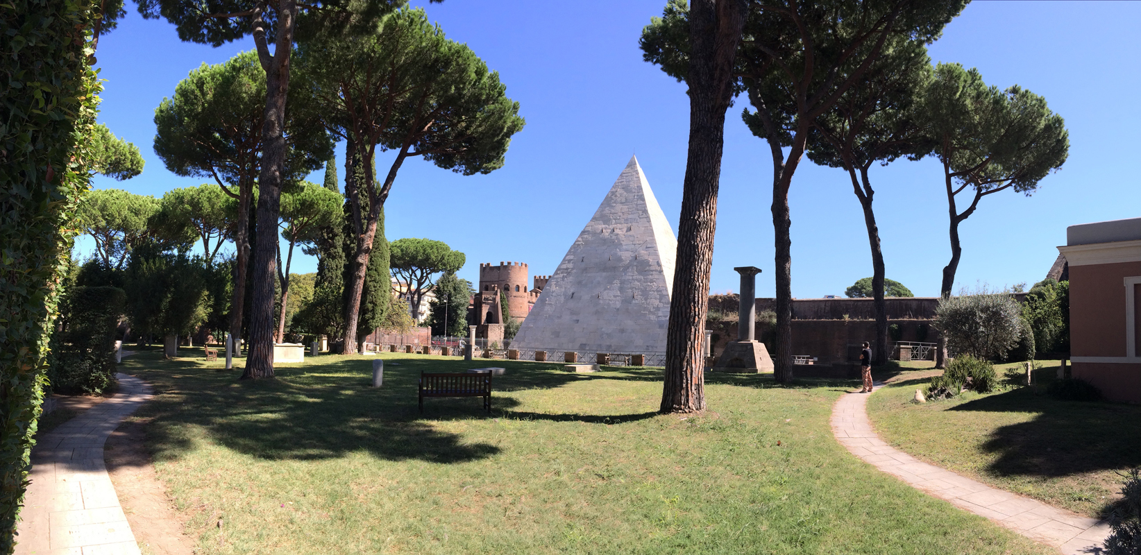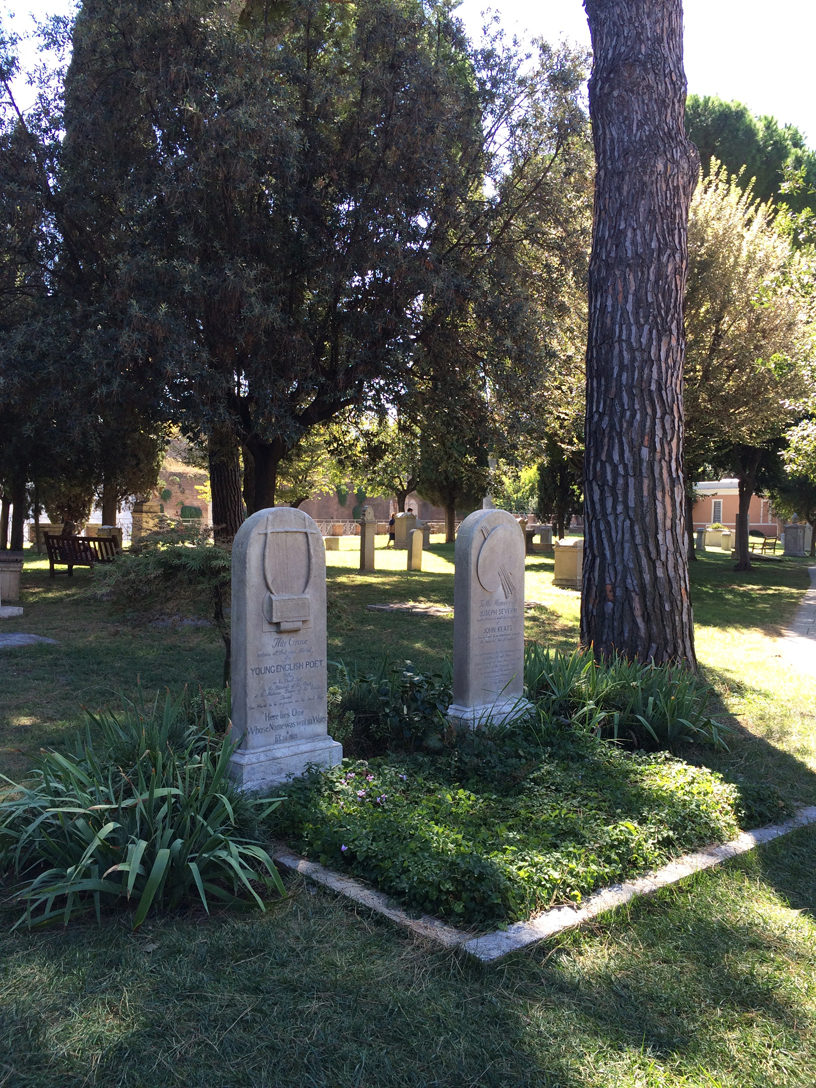 Delle due parti del cimitero, quella che amo di più è quella che fronteggia la Piramide, con il prato, i pini, le panchine, le lapidi, dove all’estremità est c’è la tomba di John Keats, accanto a quella dell’amico Severn, con l’epigrafe di cui ho già scritto. Ieri la luce era perfetta, la Piramide ripulita tanto da sembrare, se non nuova, lavata con Perlana, i pochi turisti silenziosi come si conviene in un cimitero (e anche il rumore del traffico esterno era come attutito…).