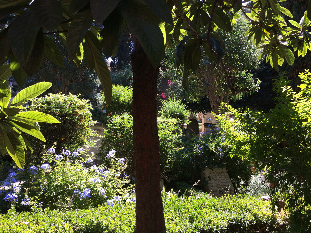 L’altra parte, quella che sale verso le mura (sotto le quali è sepolto Shelley) devo dire che la conoscevo meno. Ieri l’ho girata con calma, facendo attenzione alle radici e al pavimento un po’ sconnesso. E ne sono rimasto incantato. Per il suo cosmopolitismo: gente da tutto il mondo e di tutte le religioni (o di nessuna religione), con lapidi in tante lingue che raccontano di vite le più diverse. Per la cura con cui è tenuto. Per la vegetazione rigogliosa e ben seguita che fiancheggia e a volte sovrasta le sepolture.