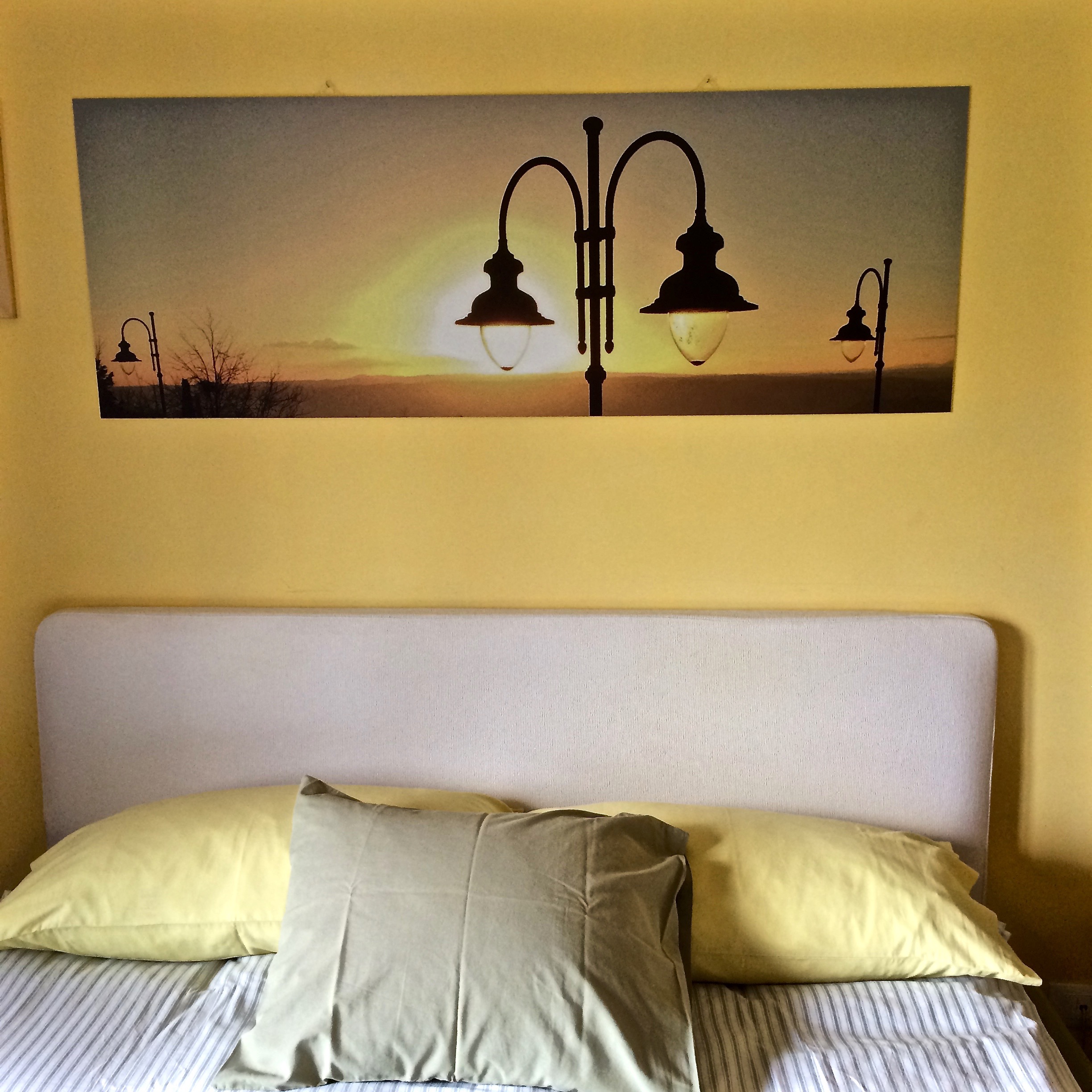 Sono fiero del risultato. Per essere un particolare di una foto fatta con l’i-Phast in modalità panoramica, il pannello con i lampioni del belvedere di Montopoli verso il Soratte ha retto più che bene l’ingrandimento a 140 cm x 50. E poi, appeso lì, dà al muro giallo, di per sé luminoso, ulteriore luce…