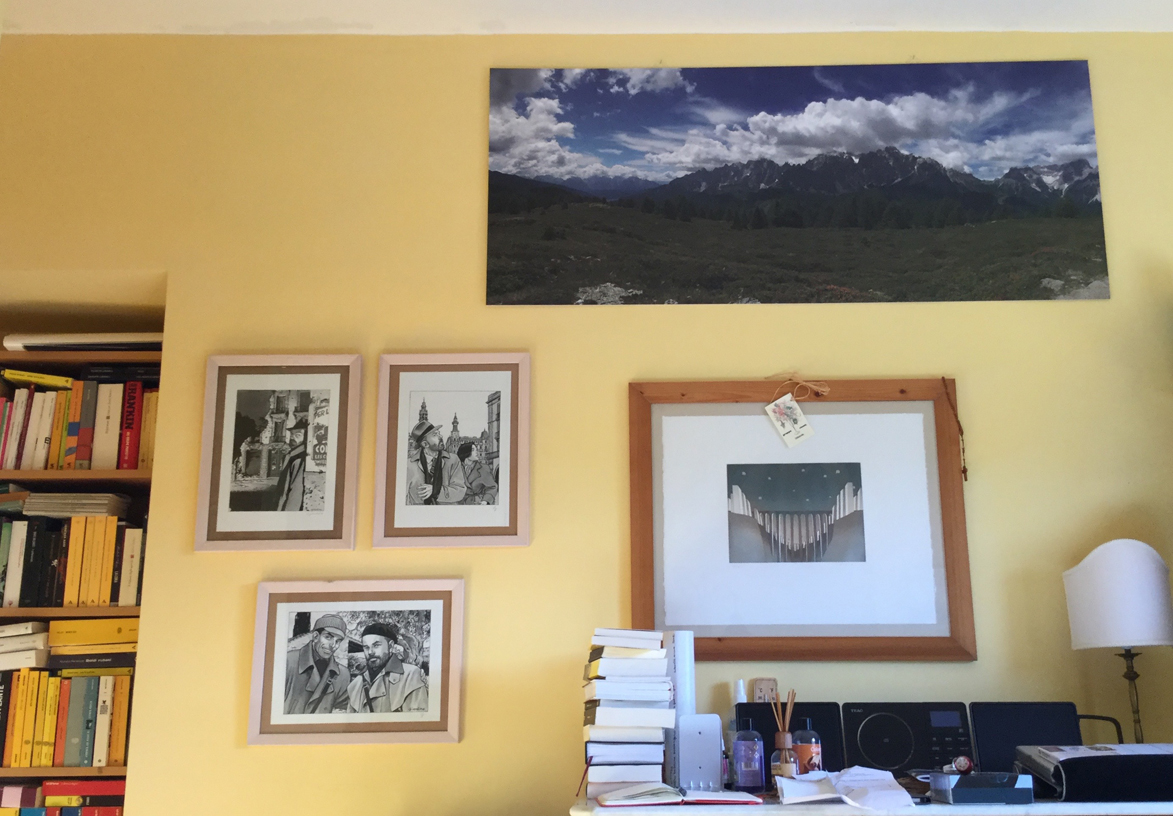 La foto (stampata 140 x 60) è stata presa quest’estate sull’altopiano che si attraversa per andare dalla Malga Nemes alla Malga Klammbach, sopra Moso, a duemila e rotti metri di quota. Al di là del prato pieno di rododendri si stagliano le Dolomiti di Sesto sotto un cielo pieno di nubi gonfie e belle. La passeggiata fu splendida; il Kaiserschmarren alla malga fu davvero eccellente; il ricordo è lì, ogni mattina, quando mi sveglio e vedo davanti ai miei occhi tanta meraviglia (e, se è per questo, anche ogni sera, prima di spegnere la luce).