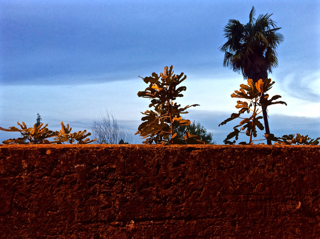 Ieri sera, faccio un salto in farmacia in paese. Esco e invece di tornare in macchina, prendo la prima stradina a sinistra. Poi, ancora a sinistra (del resto è l’unica direzione) e mi avvio verso la base dell’antica rocca di Montopoli (oggi, più che altro, case affastellate e quindi l’antico impianto urbano non è molto leggibile ). Un muro e un cancello mi separano da un giardino (mal tenuto) sul declivio del colle. Nel chiarore del lampione dal muro si affacciano tre giovani piante di fico e una (meno giovane) palma. La luce è bella. Estraggo l’i-Phast e scatto.