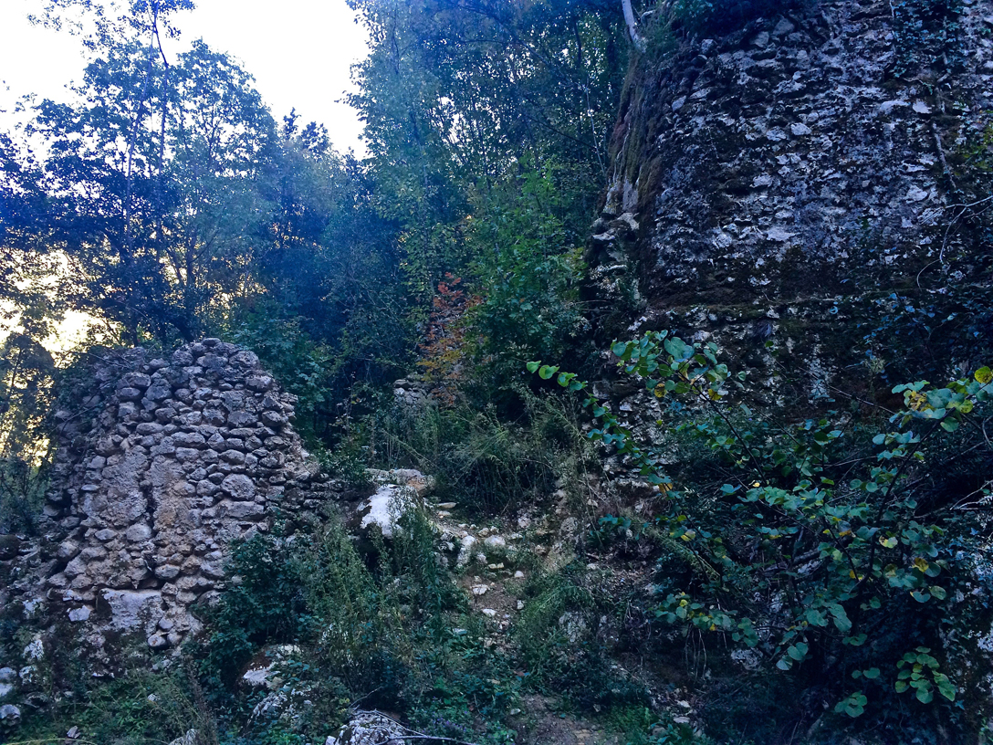 Dall’eremo, in cinque minuti di discesa, si arriva alla Mola del Comune, sulle sponde del Fosso di Galantina. La temperatura cala di colpo. Di colpo fa freddo e la luce diventa più blu. Il fosso è a secco, i ruderi compaiono tra gli alberi.