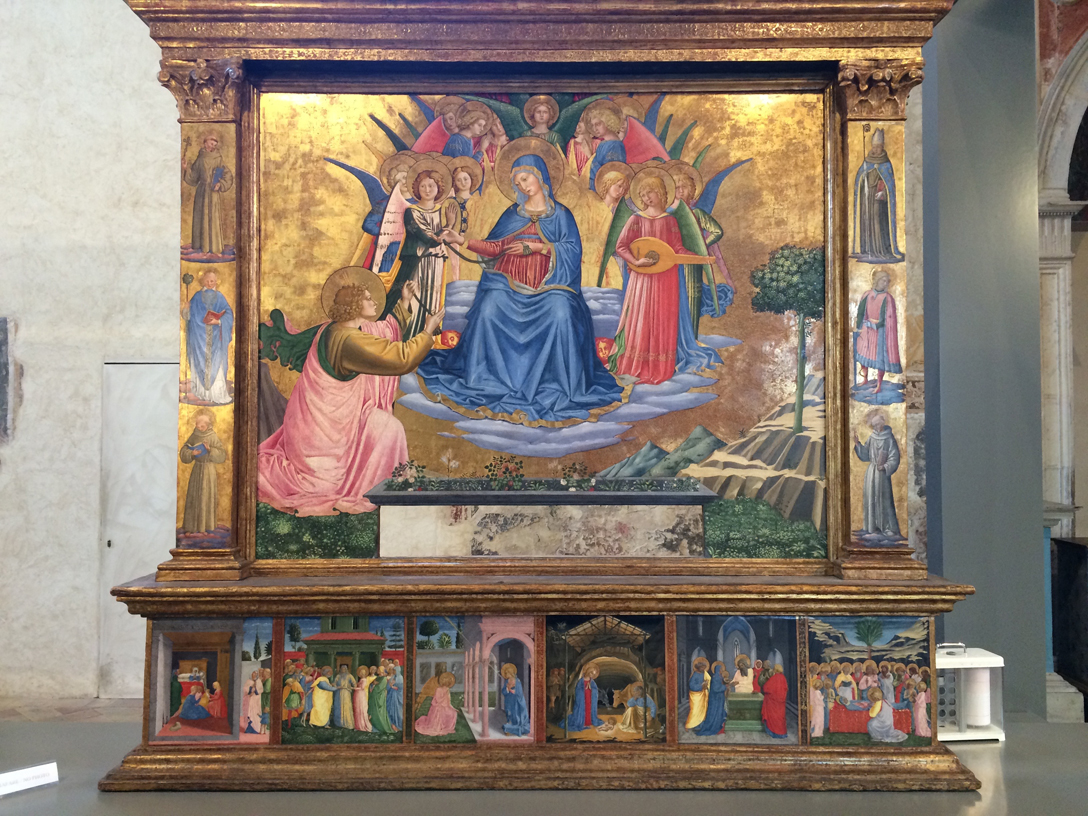 Ieri, gita a Montefalco. No, non per il vino, ma perché fino a alla fine dell’anno, nella chiesa-museo di S.Francesco, è in mostra una pala d’altare appena restaurata di Benozzo Gozzoli (il corruttore automatico suggerisce: Benzolo Bozzoli, niente male come inventiva…), la Madonna della Cinta, realizzata a metà Quattrocento per una chiesa della cittadina umbra, regalata a metà Ottocento dagli abitanti di Montefalco a Pio IX e da allora conservata nei Musei Vaticani.