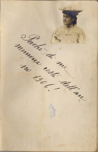 Ancora su Maria. Un quaderno con tanti fogli bianchi, intervallati con delle stampine colorate di fiori e paesaggi “romantici”. E, non all’inizio, ma dopo poco, una “fotina” ritagliata di Maria sedicenne (con un cappellino che a me, profano nella materia, ricorda un piatto di frutta) sopra una scritta obliqua a tutta pagina: “Perché di me memoria resti dell’anno 1906”. Firmato (sulla “fotina”) Mimy, come amava farsi chiamare la giovane Löffler.