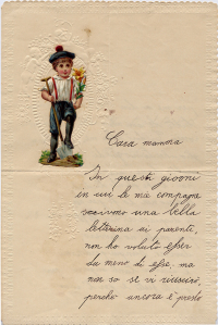 Scrive Enrico con la sua bella grafia da bambino, su un foglio di carta pregiata con sovraimpressioni e l’immagine di un bimbo dalle bretelle rosse: “Cara mamma, in questi giorni in cui le mie compagne scrivono…