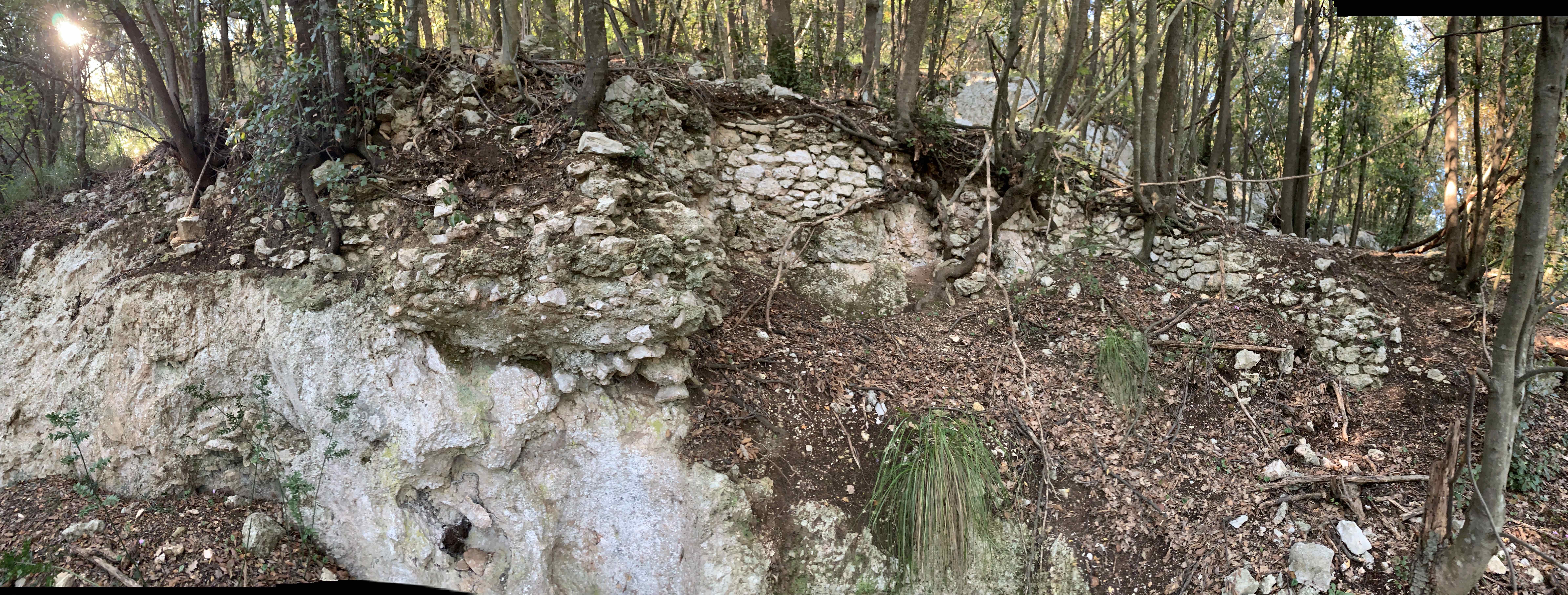 Fuori, sulla parete, poco a sinistra dell’imboccatura della grotta, una piccola incavatura, quasi una nicchia, con l’avanzo di una specie di tettino, muro e tetto realizzati in pietre, mattoni e calce. Intorno vi sono, sparsi, altri lacerti di muro. A destra, a pochi metri, una struttura scavata nella roccia, probabilmente una calcara, dalla quale parte una traccia di sentiero verso il basso, verso Toffia. Stiamo lì per un po’, scattiamo foto, giriamo video. Poi torniamo verso casa.