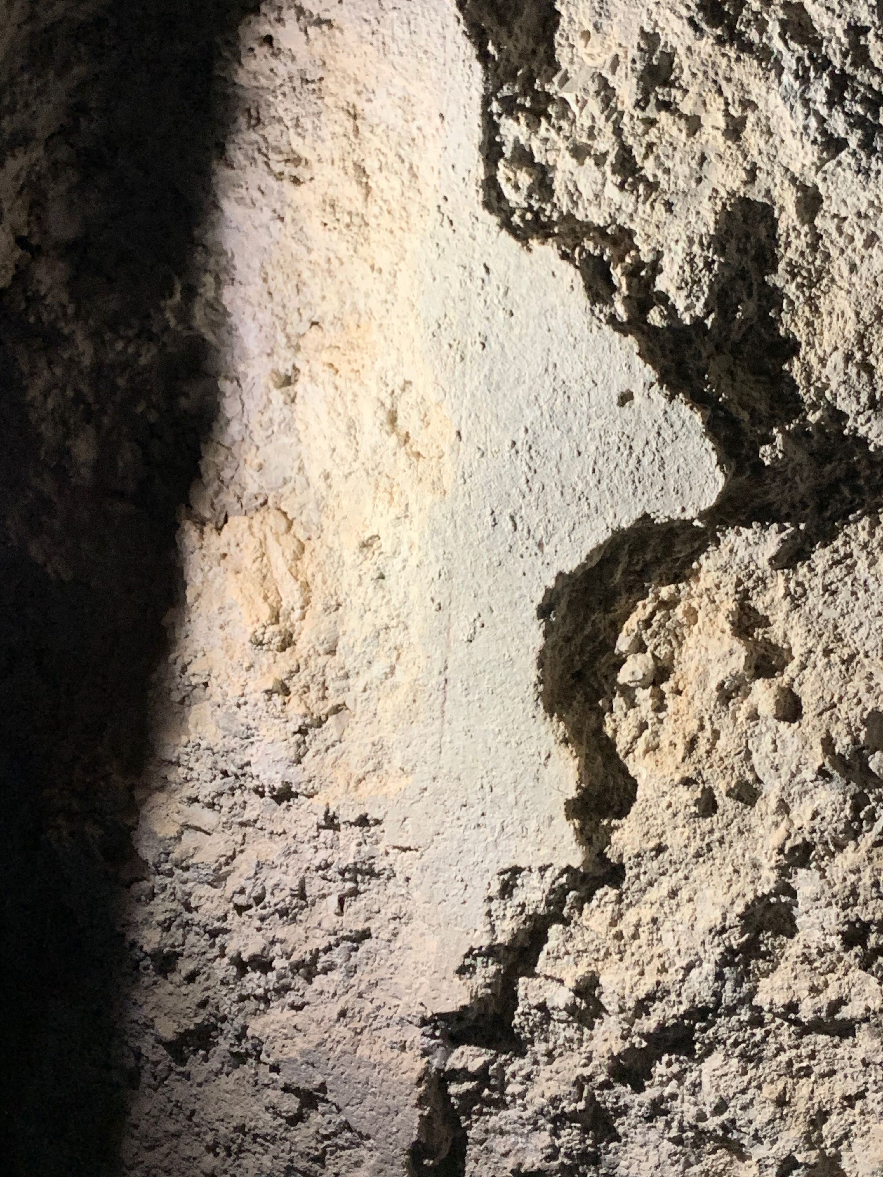 L’imboccatura è bassa ma all’interno si può stare comodamente in piedi se, come il sottoscritto, non siete alti un metro e ottanta. All’interno ci sono due vani, se così si possono chiamare, divisi da una parete di roccia. In quello di destra ci sono due specie di nicchioni, scavati, non naturali, uno dei quali quasi pavimentato. Nel vano di sinistra, quello più grande, su una parete i resti di un intonaco fanno pensare a qualche tipo di dipinto di cui non rimane però nessuna traccia (o quasi nessuna, a essere ottimisti o dotati di una gran vista).