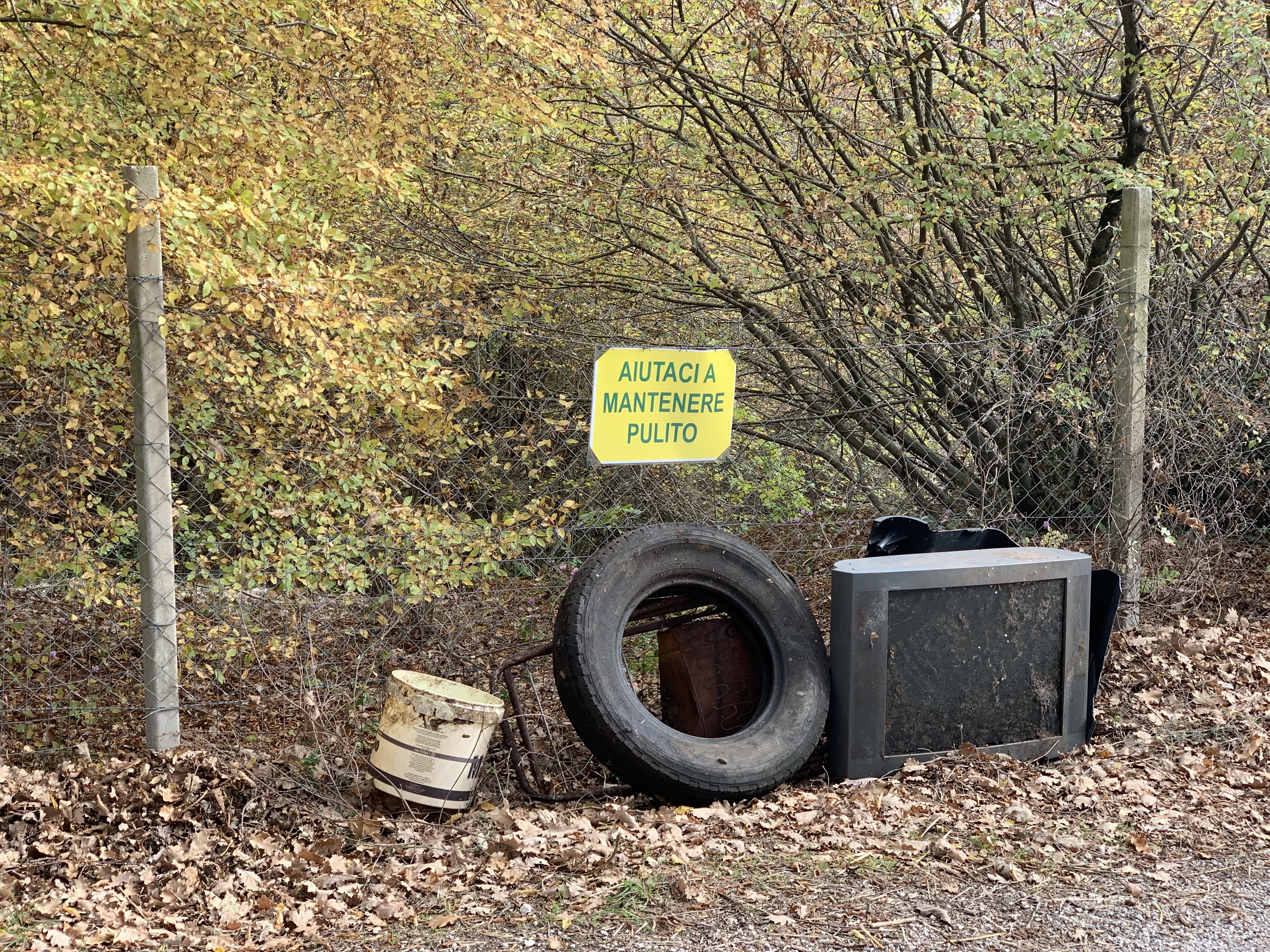 E allora viva la sfrontatezza di chi, davanti a un cartello che invita ad aiutare a mantenere pulito, lascia i propri rifiuti proprio lì sotto, magari per irridere la buona volontà e la buona fede di chi si fida del prossimo; ma, così facendo, lascia i rifiuti a portata di raccolta e non a marcire per sempre in luoghi irraggiungibili.