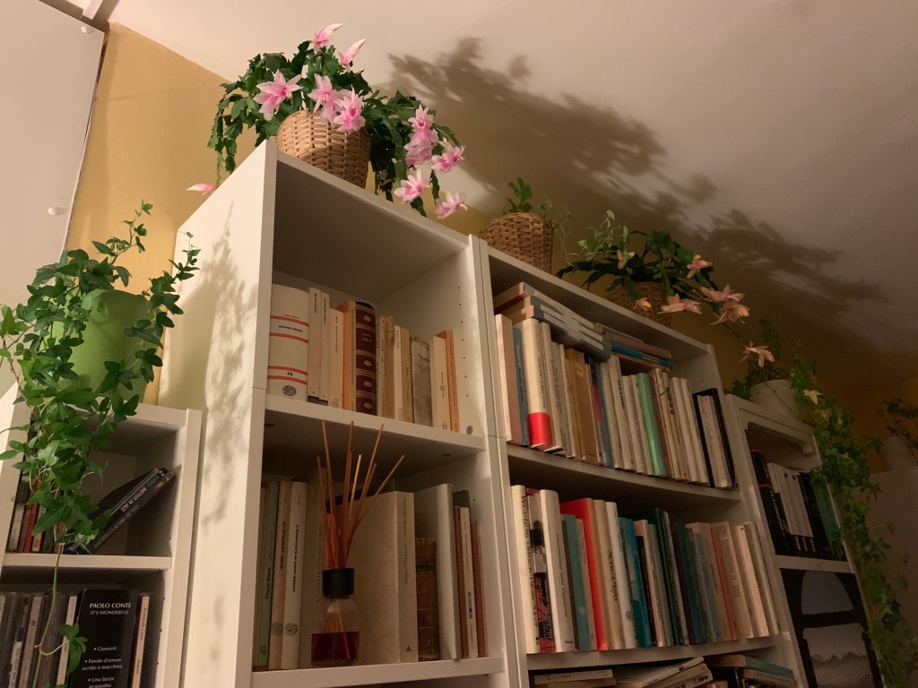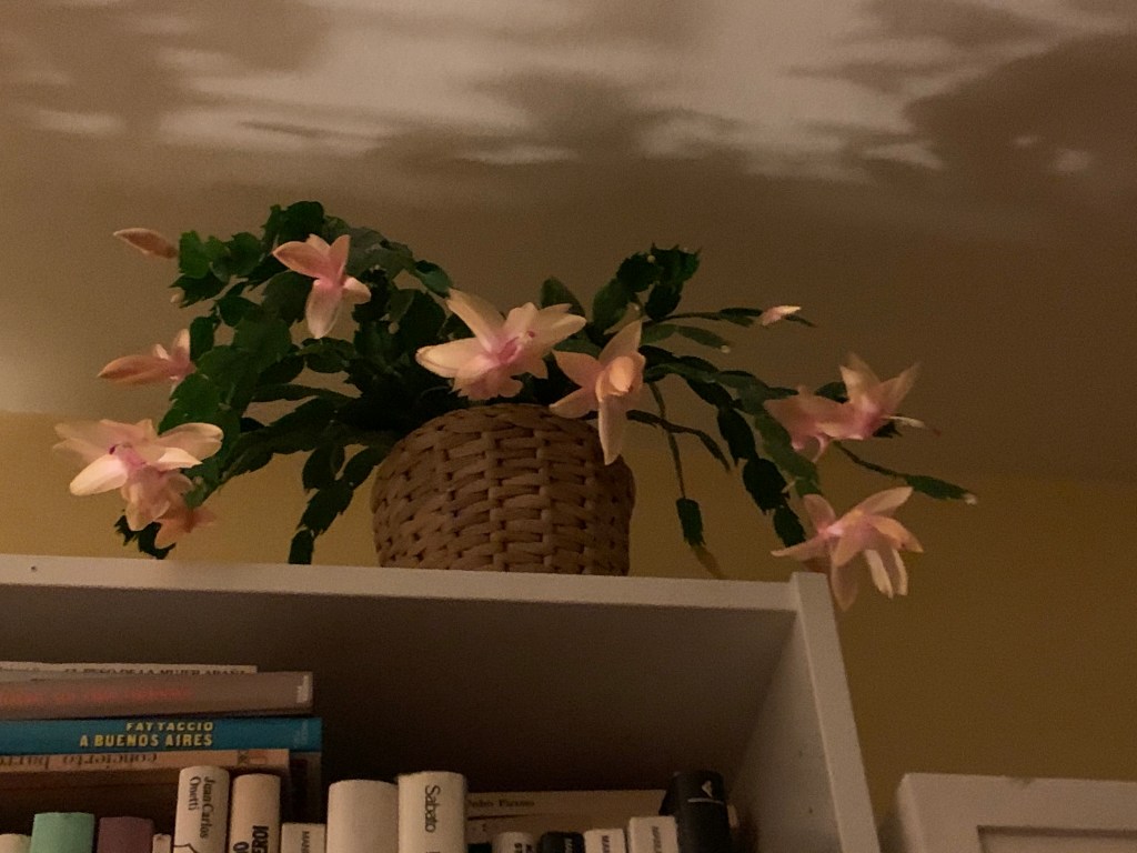 Oggi entrando nel mio studio ho notato che le due piante grasse che stanno sulla libreria all’ingresso sono fiorite. Fiori ricchi e abbondanti, dai bei colori. Sono andato a vedere sui vasetti come si chiamino e il nome riportato (sono piantine comprate da Ikea e gli svedesi sono sempre precisi) è Schlumbergera Truncata.