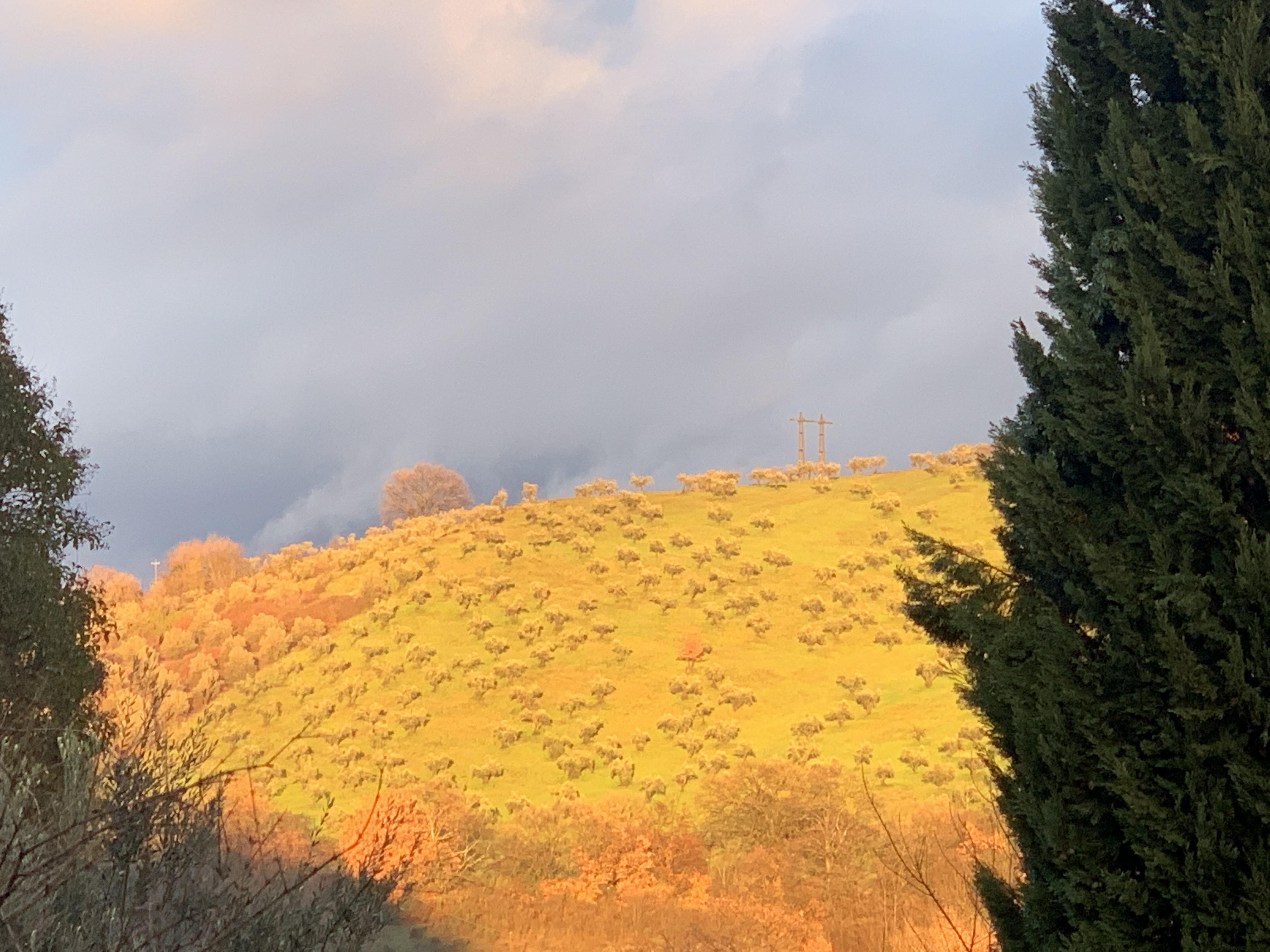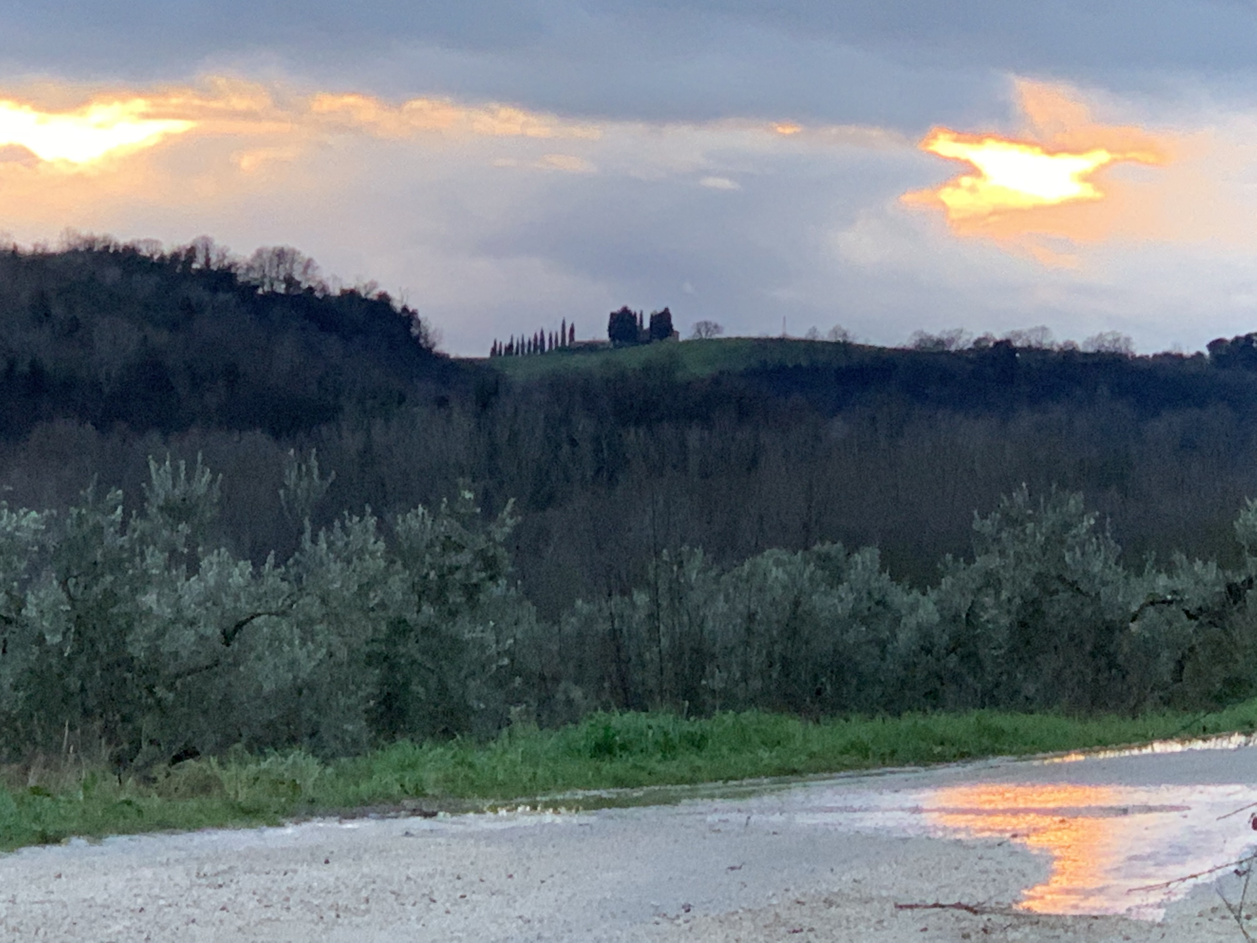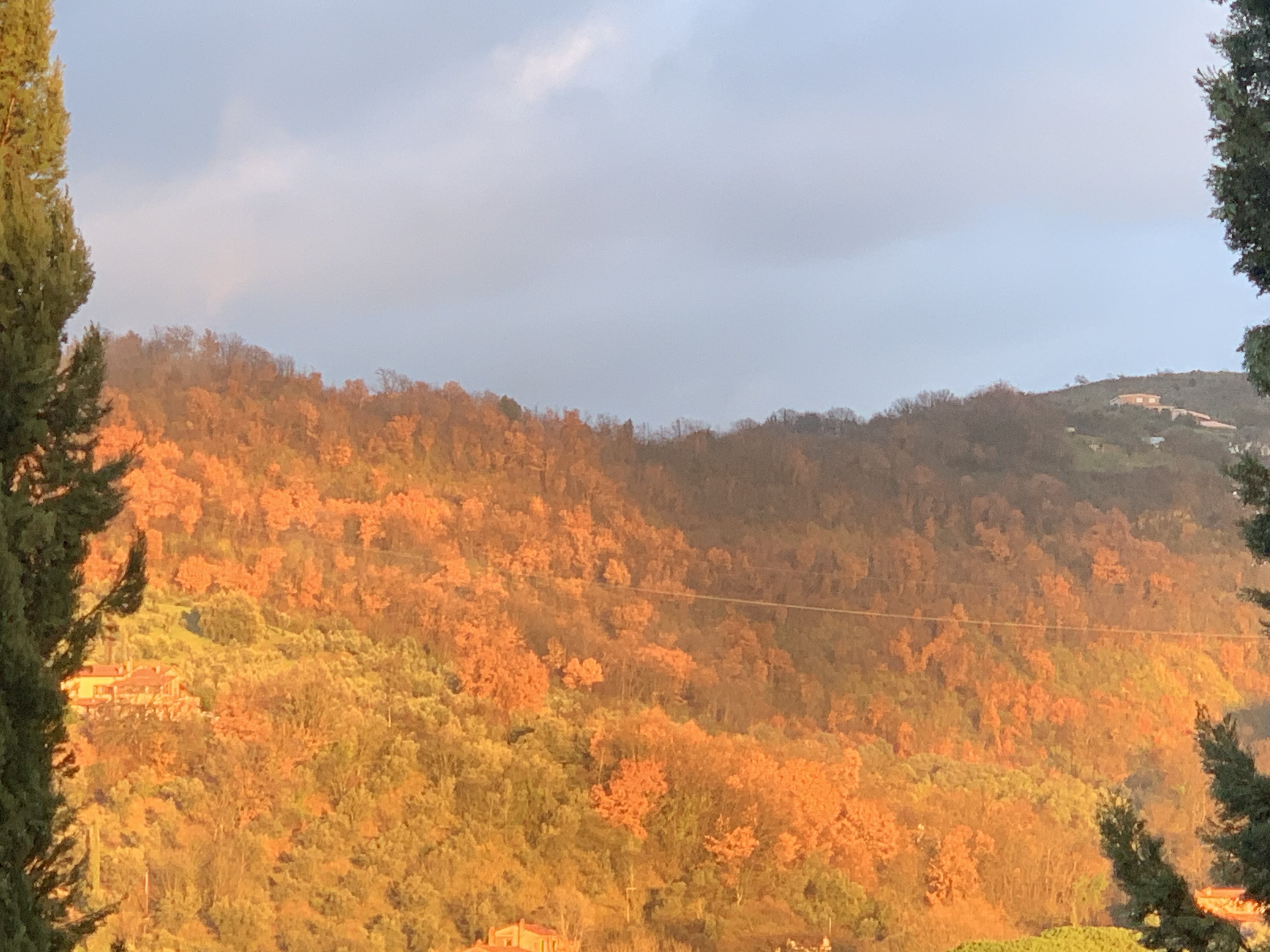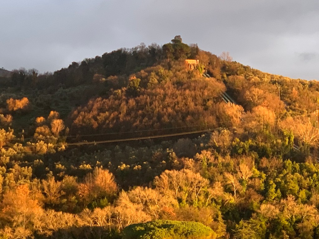 Non un tramonto classico con il sole che scende sulla linea dell’orizzonte, ma quei tramonti al contrario che viviamo qui nella valle, quando la luce cambia, tutto trascolora e volge al desio e ai naviganti – e anche a chi poggia saldamente (?) i piedi per terra – stranisce il core. Sì, perché non sapere dirla, questa sensazione, mi lascia un di più d’insoddisfazione, come se oltre a non sapere dirli non riuscissi nemmeno a goderli pienamente, questi momenti di grazia.