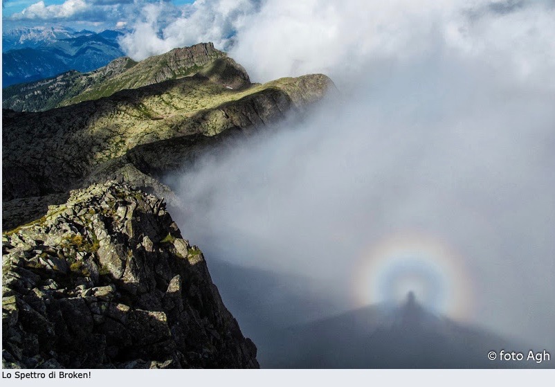 E oltre alle emozioni ho acquisito anche conoscenze che mi saranno utili nella mia prossima vita, quando sarò uno scalatore provetto (oltre a essere un capellone biondo e un pianista con i fiocchi) e anche conoscenze che non hanno nessuna utilità ma che mi fanno sentire più “ricco”. Come la scoperta della “gloria” detta anche “spettro di Broken”. Sapete cos’è? No? Secondo Wikipedia è «un fenomeno ottico prodotto dalla luce riflessa verso la sua fonte da una nuvola di goccioline d’acqua di dimensioni uniformi. Più concretamente, essa è un’illusione di un enorme ingrandimento dell’ombra proiettata dall’osservatore, quando il Sole è basso, sulla superficie delle nuvole che circondano una montagna su cui l’osservatore si trova. Solitamente è caratterizzata dalla presenza di una corona luminescente intorno al capo o comunque alla parte più alta della figura”.
