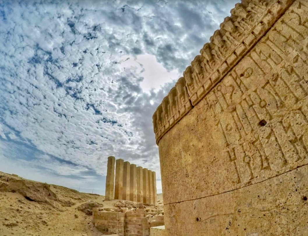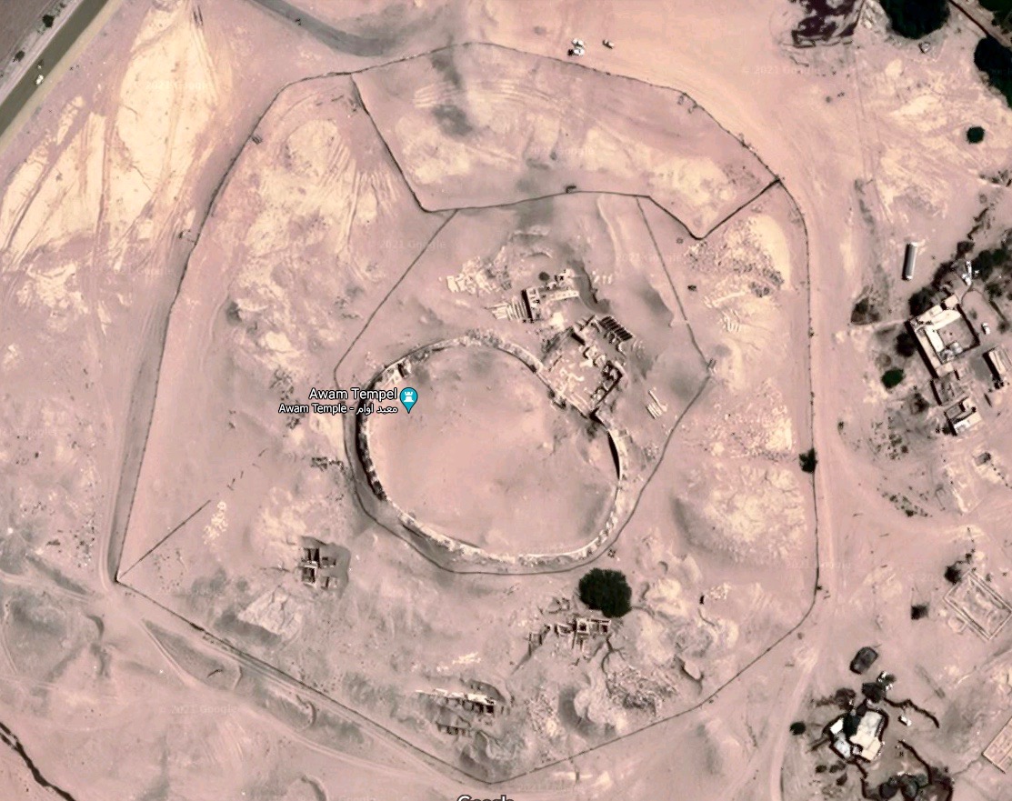 No, lì vicino c’è anche un altro tempio, il tempio di Awwam, anch’esso dedicato ad Almaqah e anch’esso legato alla memoria della regina di Saba. Se possibile è ancora più impressionante, anche se nella discesa dal satellite il segnalino non compariva e ho dovuto attivare la funzione “ricerca” una volta conscio della sua esistenza. Ci sono più edifici, tante sculture e iscrizioni, tante iscrizioni (several dozens, parecchie dozzine, dice la Wikipedia inglese, tutte risalenti all’ultimo periodo del regno Sabeo). E poi c’è un grande spazio ovale circondato da mura (lunghe oltre 750 metri e alte, adesso, 13 metri) che era la vera area sacra, la “casa” di Almaqah, che ha al suo interno varie strutture e più di una fontana.