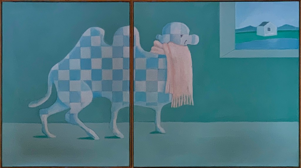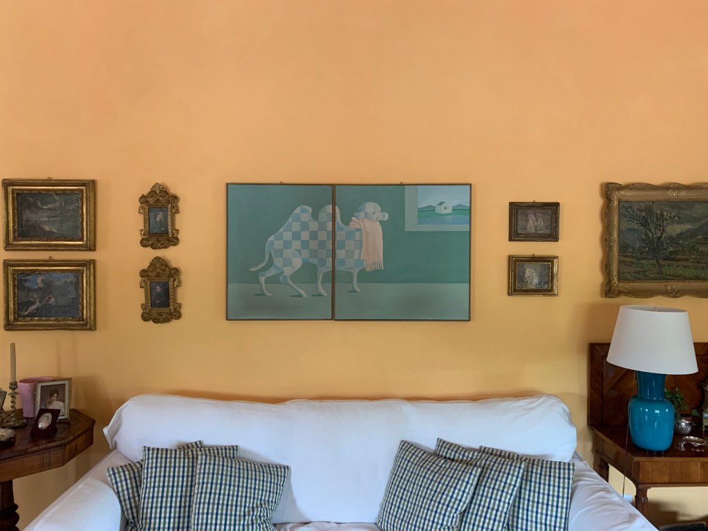 Casa nostra è cambiata un po’, con i lavori fatti soprattutto in salotto. Il colore (un arancione un po’ meno vivace di prima), il rialzo del camino, ma soprattutto la nuova disposizione dei quadri, con la grande novità della new entry sopra il divano, il dittico del cammello sciccoso (la responsabilità del titolo è tutta mia…), con il manto a scacchi celesti e la sciarpa rosa, opera di mio cognato Giuseppe, che Emanuela sua figlia ci ha dato giorni fa. Nel salone ci sono altre due tele di Giuseppe che dialogano con il nuovo arrivato e danno un tono diverso alla stanza.