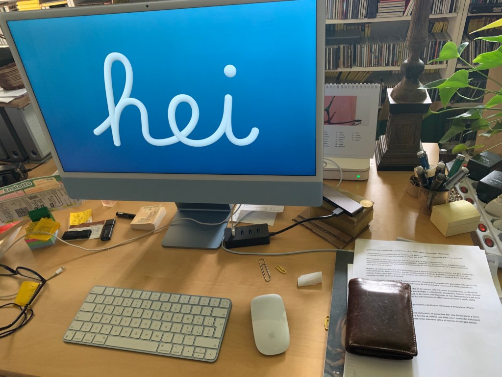 No, non è il mio splendido nuovo iMac (e cordiale:«hei», mi dice, quando lo trascuro da un po’) che chiamerò Houdini. No, il nome del grande escapista lo affibbierò all’oggetto in basso a destra nella foto. Il mio non nuovo e non splendido portafogli che oggi, per la seconda volta in neanche una settimana, ha provato a dileguarsi.