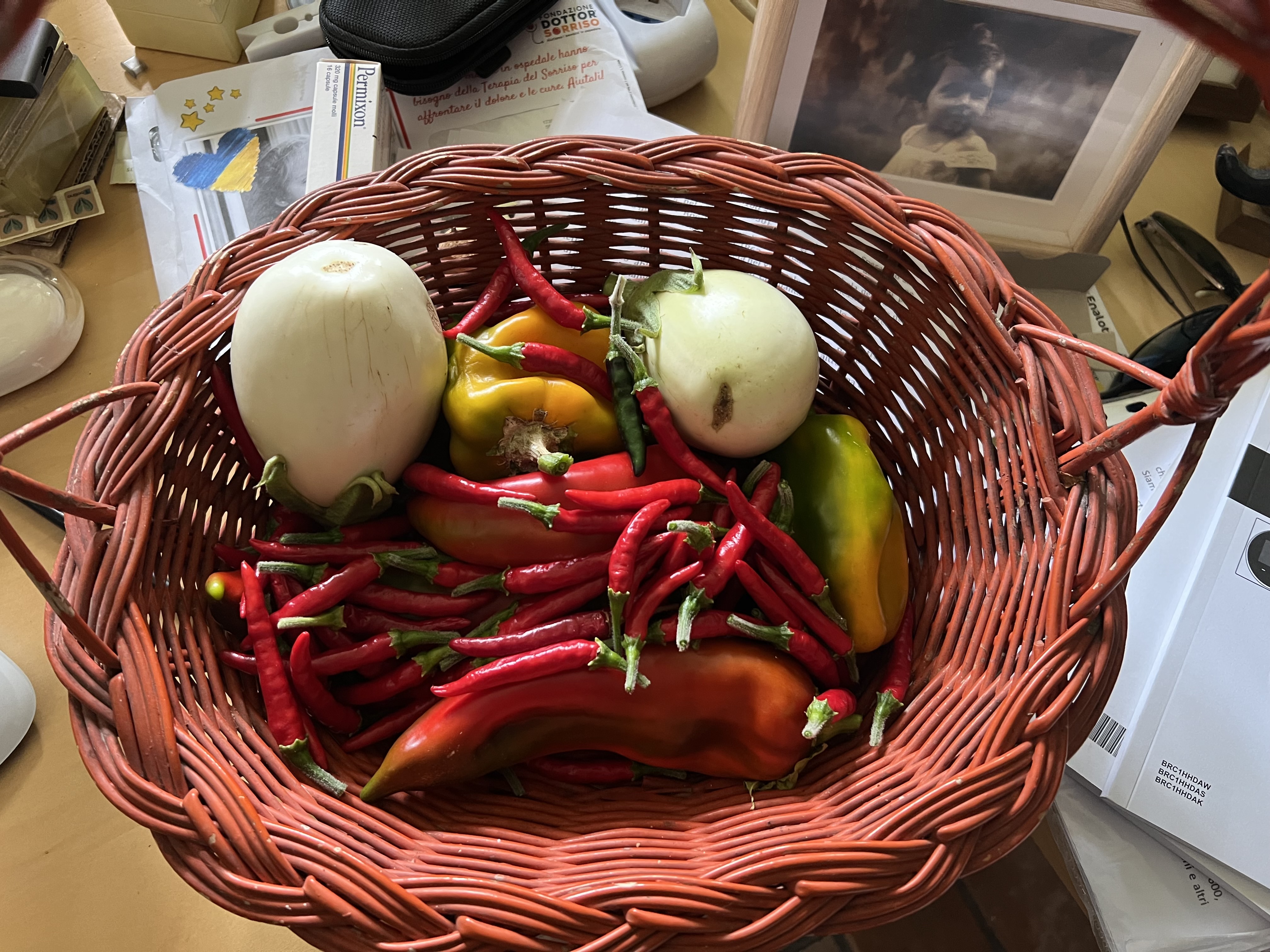Ma scendere in campo con la forbice e zac, spiccare le melanzane bianche e i peperoni, gialli e rossi dalle piante ancora produttive e ancora in fiore (!) è una soddisfazione senza pari. Per tutto il resto c’è il bancomat…