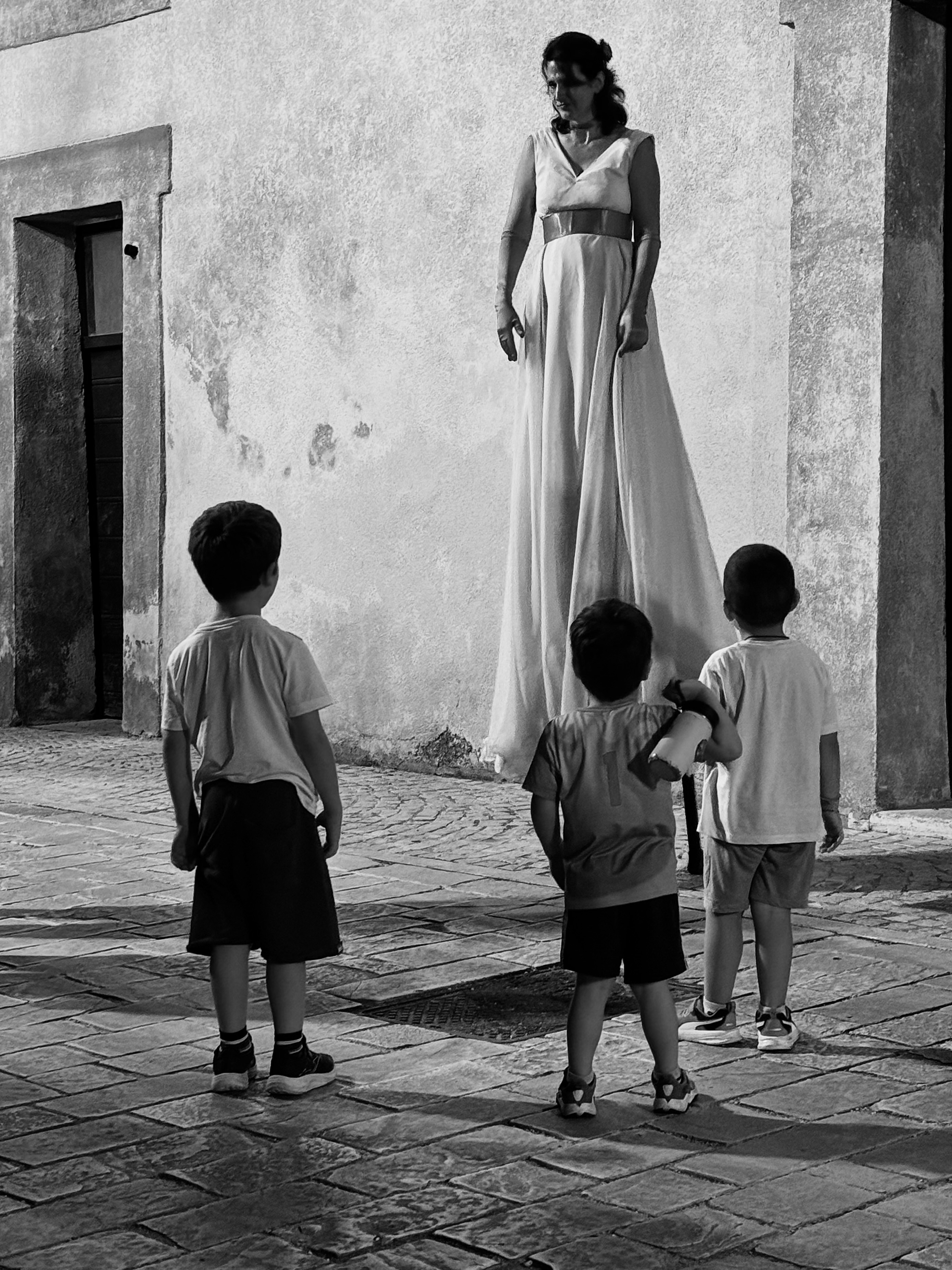 Non c’è niente da fare, ormai, in epoca di fotografia digitale e di smartphone con telecamere intelligenti (e con la possibilità di postprodurre intervenendo decisamente su luminosità e contrasto – e altro ancora) quello che serve per una buona foto è solo un po’ di culo: essere al posto giusto nel momento giusto e scattare. Magari proprio quando uno dei bambini dice all’attrice del Teatro Potlach: Ma che sei una giraffa?