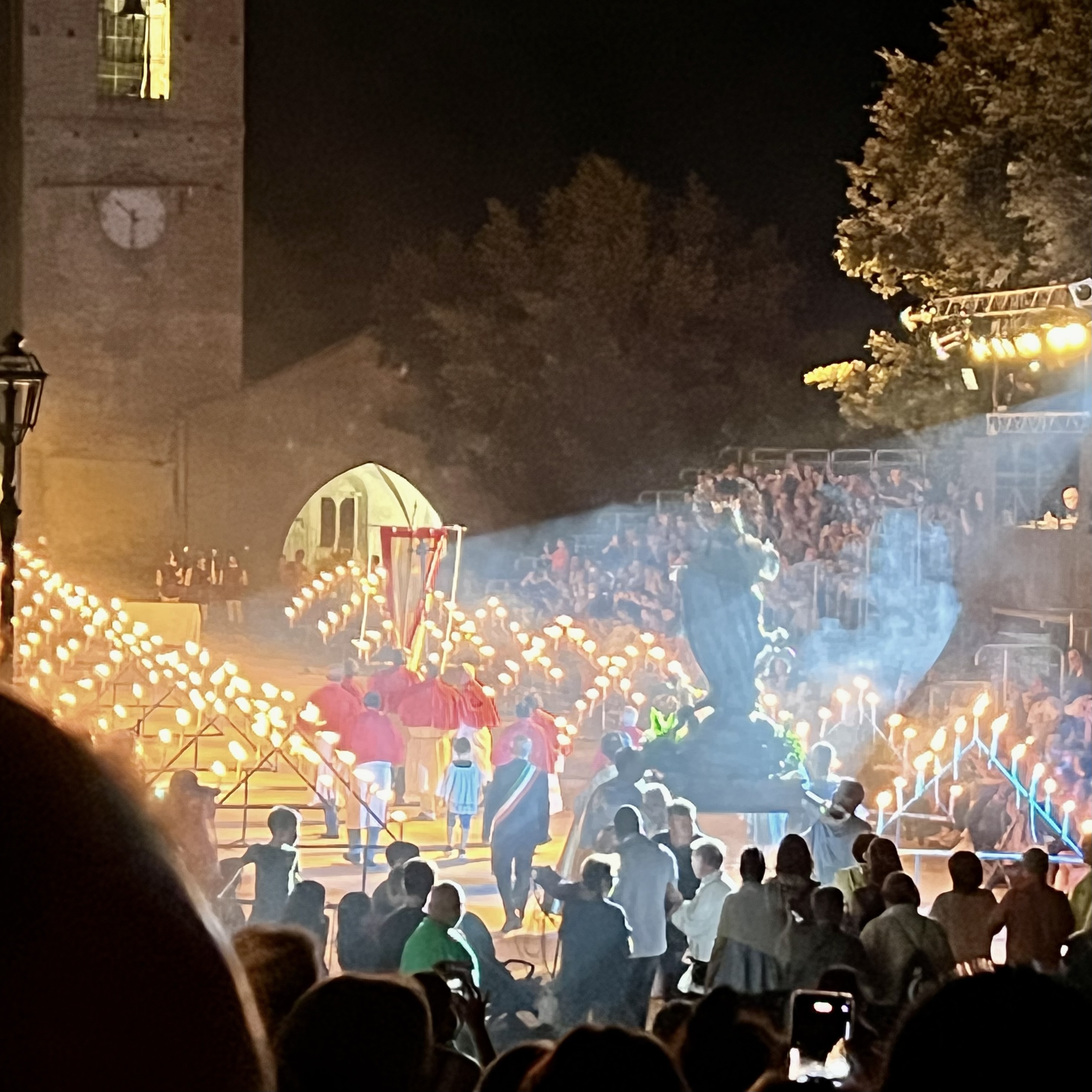 Le decine e decine di fiaccole, il triangolo bianco del fascio di luce del riflettore sulla statua della Madonna, il cellulare in primo piano che riprende la scena. Sembra di sentire la musica e il brusio della gente…