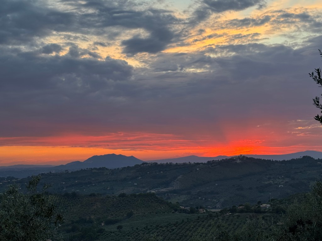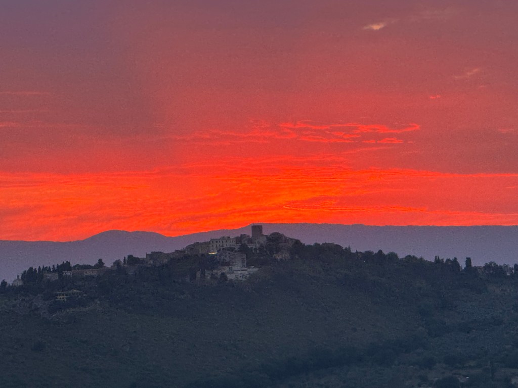 Diciamolo: questo scatto che ho utilizzato per il mese di novembre del Calendario 2026 è proprio scenografico. C’è stato un piccolo intervento in postproduzione, nel passaggio al formato quadrato, soprattutto per schiarire un po’ la parte inferiore dell’immagine, borgo e sottostanti balze boscose, peraltro anche un po’ ingranditi. Ma i colori sono quelli, il cielo rosso è proprio così rosso, come si vede anche dall’originale qui sotto e da una foto meno in dettaglio scattata neanche mezzo minuto prima che vede Montopoli all’estremità destra della foto e, dall’altra parte, il Soratte.