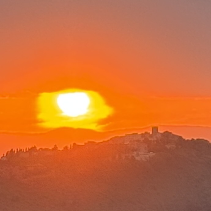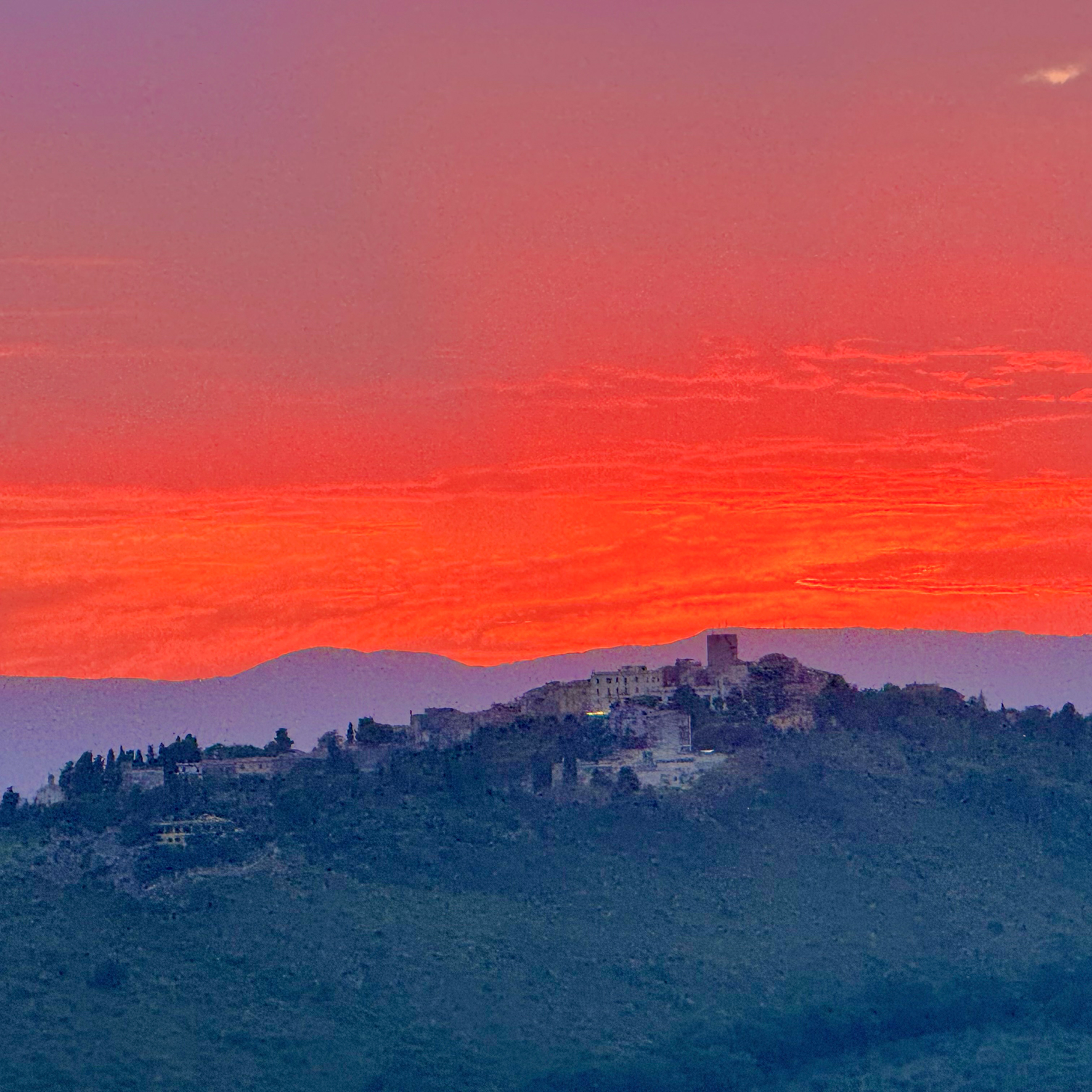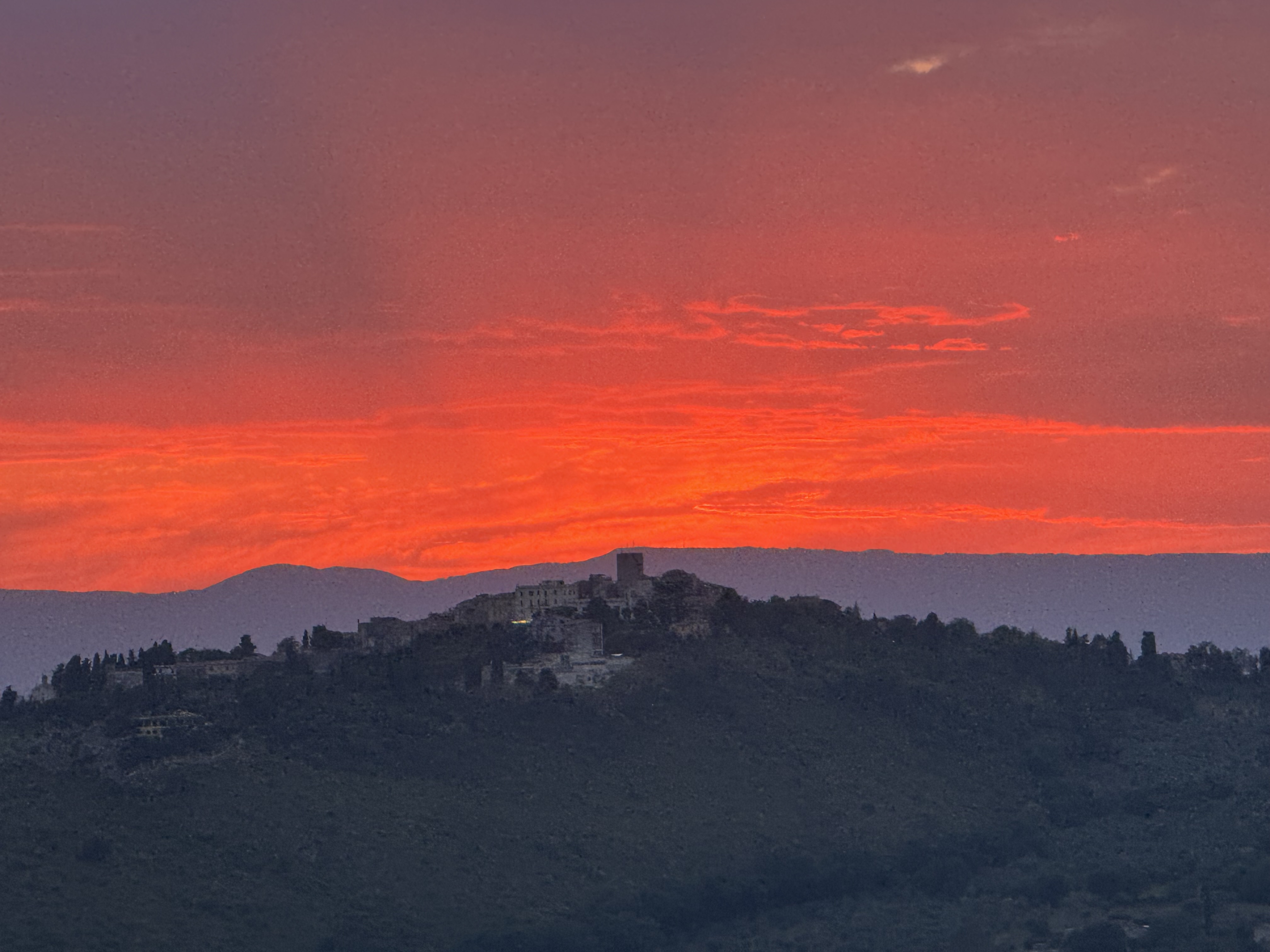 Diciamolo: questo scatto che ho utilizzato per il mese di novembre del Calendario 2026 è proprio scenografico. C’è stato un piccolo intervento in postproduzione, nel passaggio al formato quadrato, soprattutto per schiarire un po’ la parte inferiore dell’immagine, borgo e sottostanti balze boscose, peraltro anche un po’ ingranditi. Ma i colori sono quelli, il cielo rosso è proprio così rosso, come si vede anche dall’originale qui sotto e da una foto meno in dettaglio scattata neanche mezzo minuto prima che vede Montopoli all’estremità destra della foto e, dall’altra parte, il Soratte.